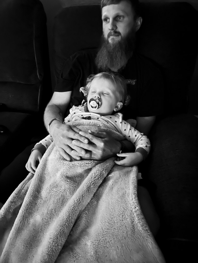 She curls up in daddy’s arms, and there she finally finds perfect rest.