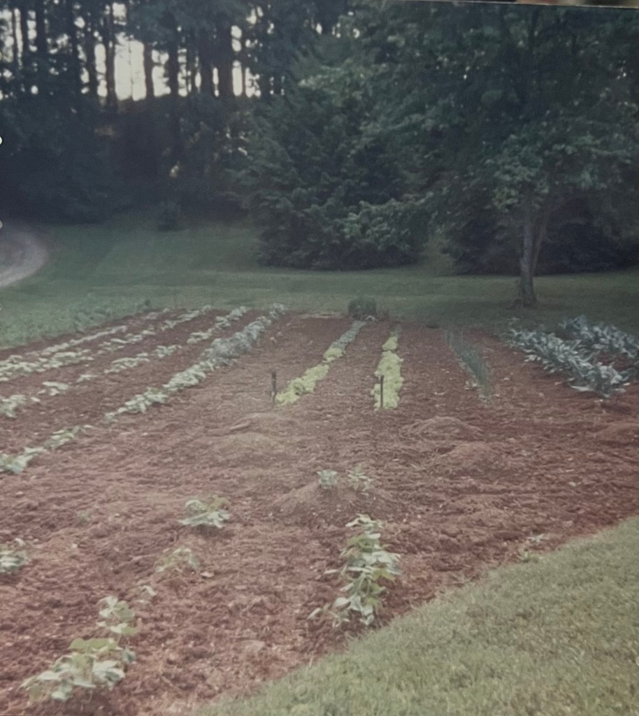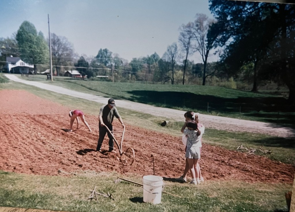He would go back and forth, row by row, until he had the size he wanted to plant and hold the vegetable plants, the ones that would bear actual fruit for us to eat through the summer and winter months.